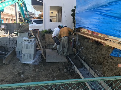 ブロック積みにより駐車場やスロープのラインを決定。