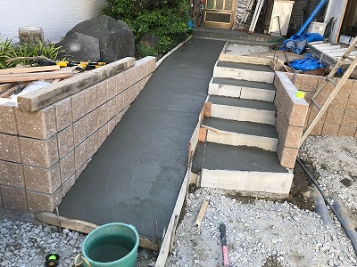 外構工事の多くはブロック積みから始まり、全体の位置関係や高さを決定します。本施工でもブロックを積みながら階段を同時に形成し、その後スロープを成型していきました。