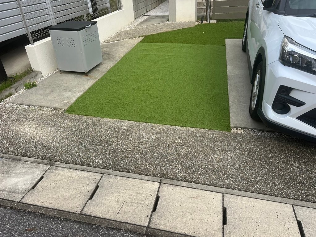 | 施工種別 | 天然芝撤去+人工芝施工、駐車場砂利敷き、防草シート施工 |