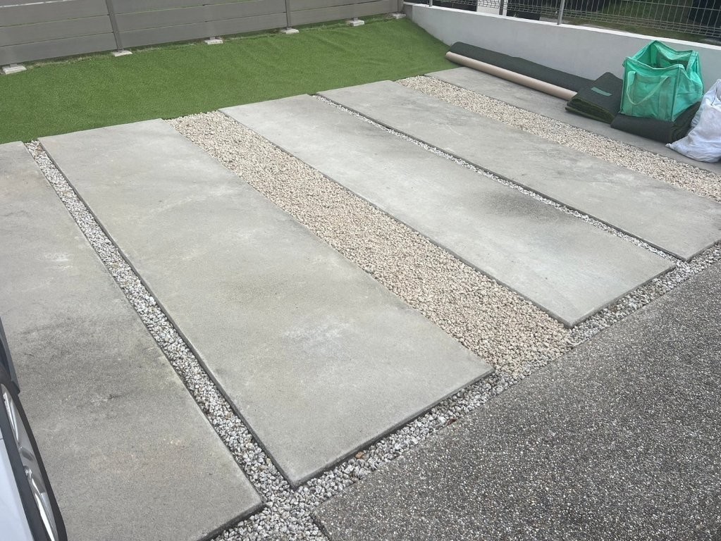 さらに、駐車場まわりは車の出入りが多いため、人工芝ではなく砂利敷き+防草シートで耐久性と雑草抑制を両立させるプランをご提案しました。