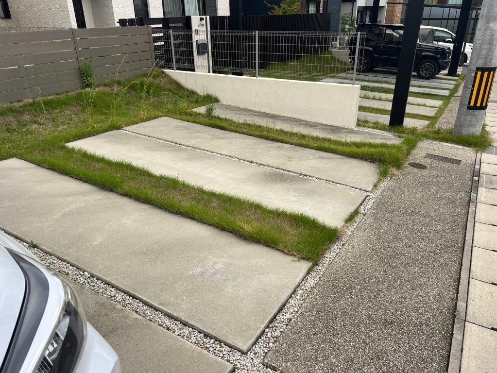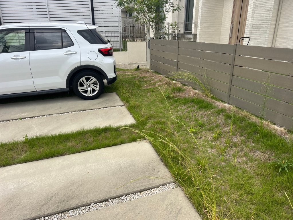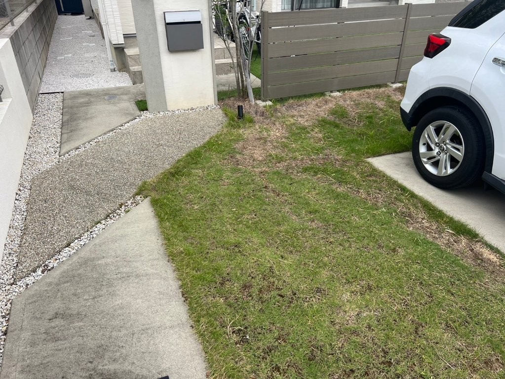 また、駐車場まわりは車の出入りによる踏みつけで芝が生育できず、雑草だけが伸びるため管理が難しい状況でした。