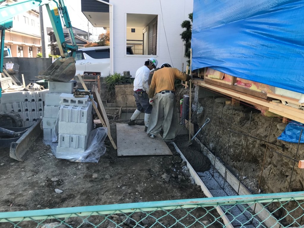 まずは、駐車場全体の地盤を掘削し、転圧でしっかり締固めます。その後、土間コンクリートの強度を確保するため鉄筋を組み、型枠を設置。