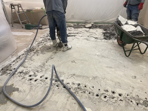 施工前の既存床には、明らかに強度不足を感じる箇所があり、斫りを進めると土間コンクリートが大きく割れながら浮いてくる状態でした。